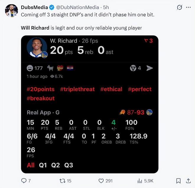 就連NBC賽后都為理查德瘋狂打Call,全場比賽理查德19分鐘,7中6,三分4中4,拿到20分5籃板,命中率85.7%,三分命中率100%,真實(shí)命中率114.2%,沒錯(cuò)TS%高達(dá)114.2%,這個(gè)效率值太高了。