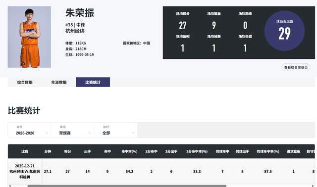 事實證明,這位出生于1999年的內線大個子,油箱里還有很多油。在NBL賽場首秀,朱榮振的表現堪稱驚艷,他首發出戰,打了27分鐘,14投9中,三分球6投2中,8罰7中,砍下27分9籃板1搶斷2扣籃1蓋帽3犯規,正負值+27,全隊第一。