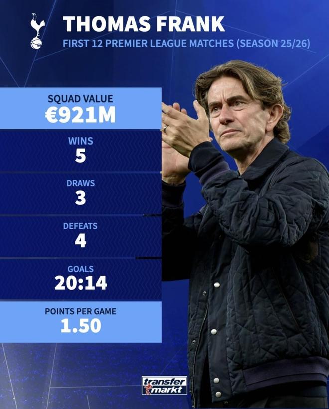 來到熱刺之后,這份榜單里的表現是20進14失、5勝3平4負排第9,本質上延續了他“先把防守和比賽強度立住,再慢慢加進攻配置”的思路:凈勝球為正、輸得不算多,說明整體框架已經搭起來了,但進攻端還偏謹慎,更多靠戰術紀律和定位球吃飯,而不是強行打成真正的爭冠強度。