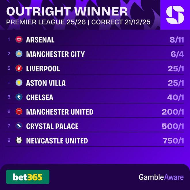 英超奪冠賠率:阿森納、曼城前二,維拉升至并列第三